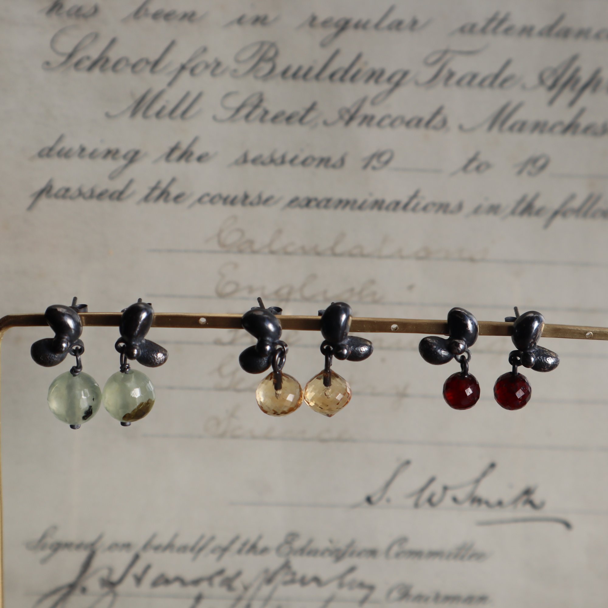 Silver cluster earrings with gemstone bead drops, available with prehnite, citrine and garnet beads.