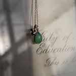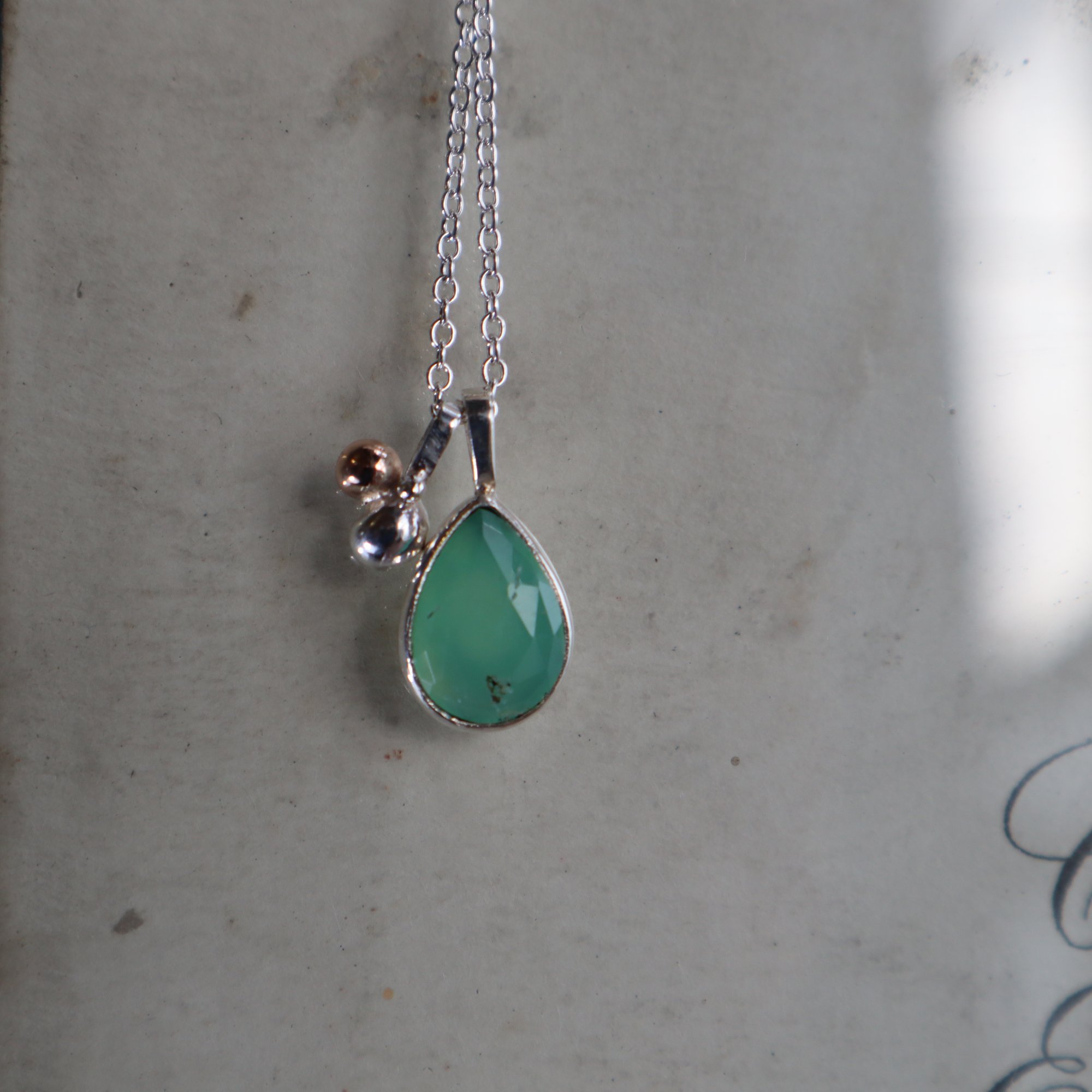 Rose cut chrysoprase (11x8mm) set in silver with silver and gold charm on 16inch silver chain