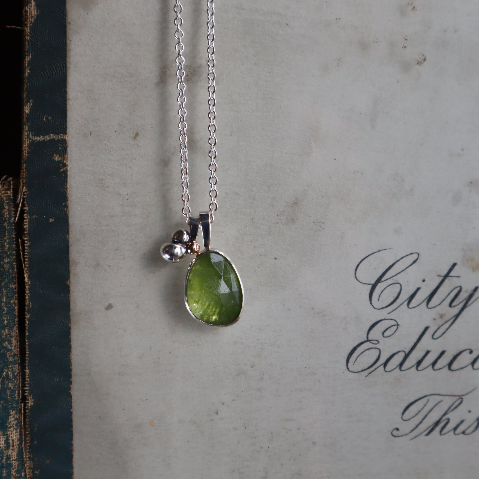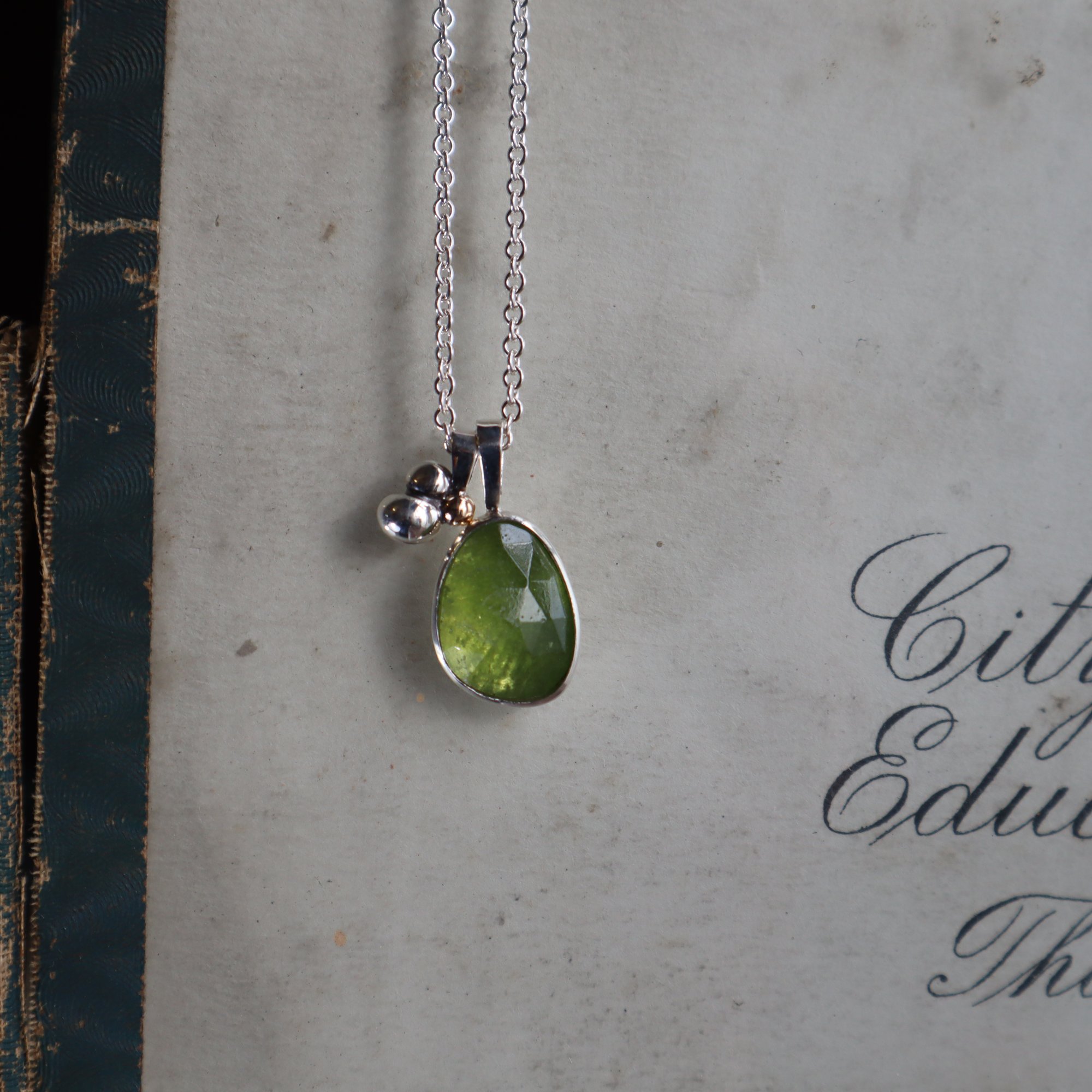 Rose cut vesuvenite (15 x 9mm) set in silver with silver cluster charm with gold ball on 18 inch chain, can be worn at 16 inch.