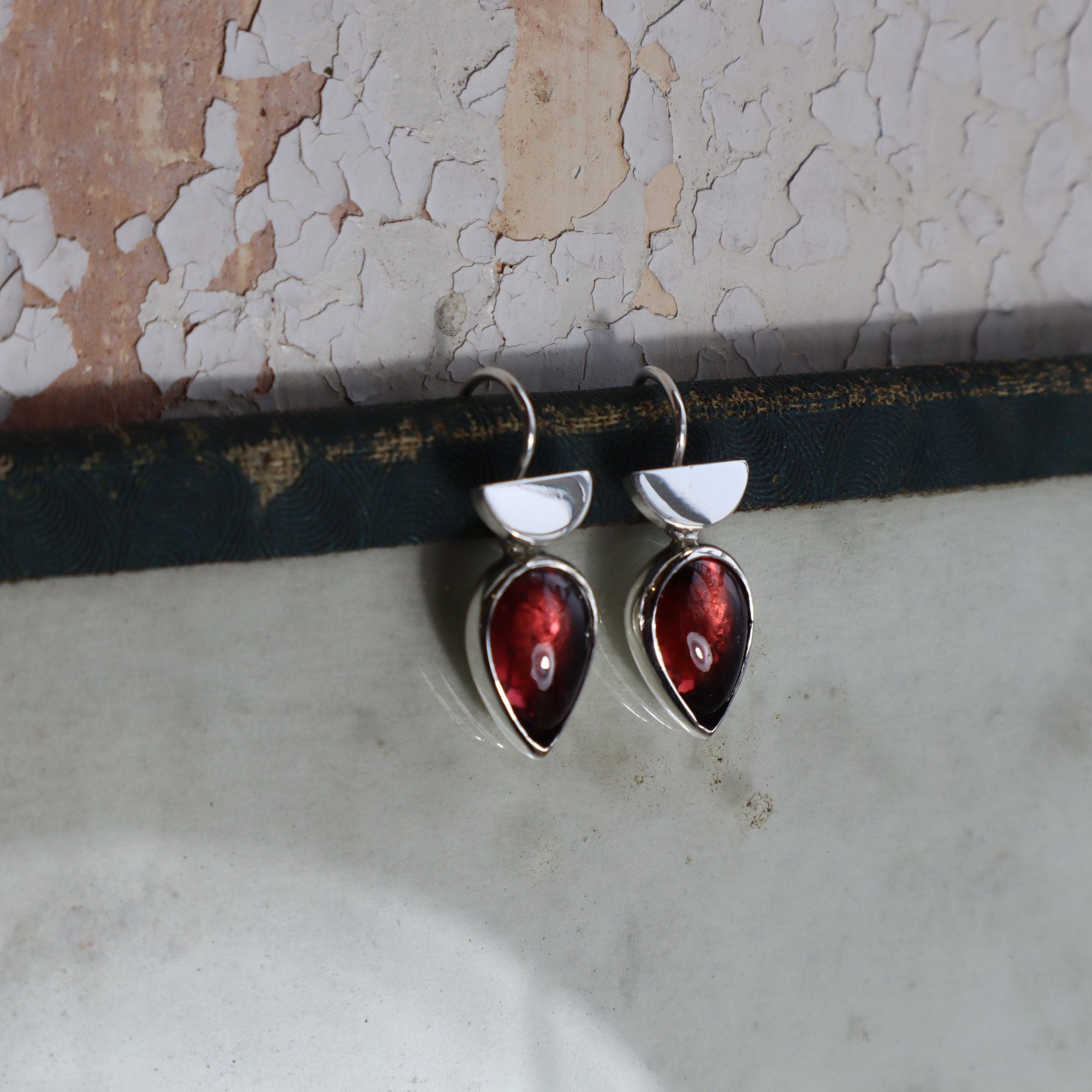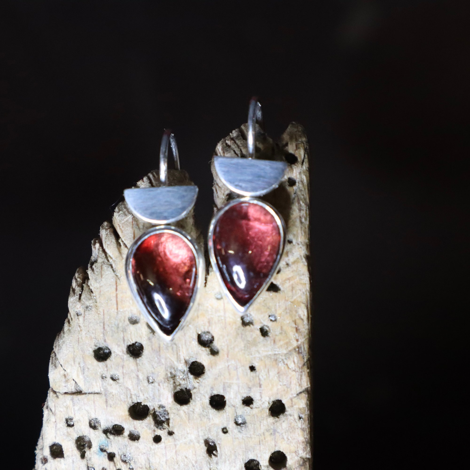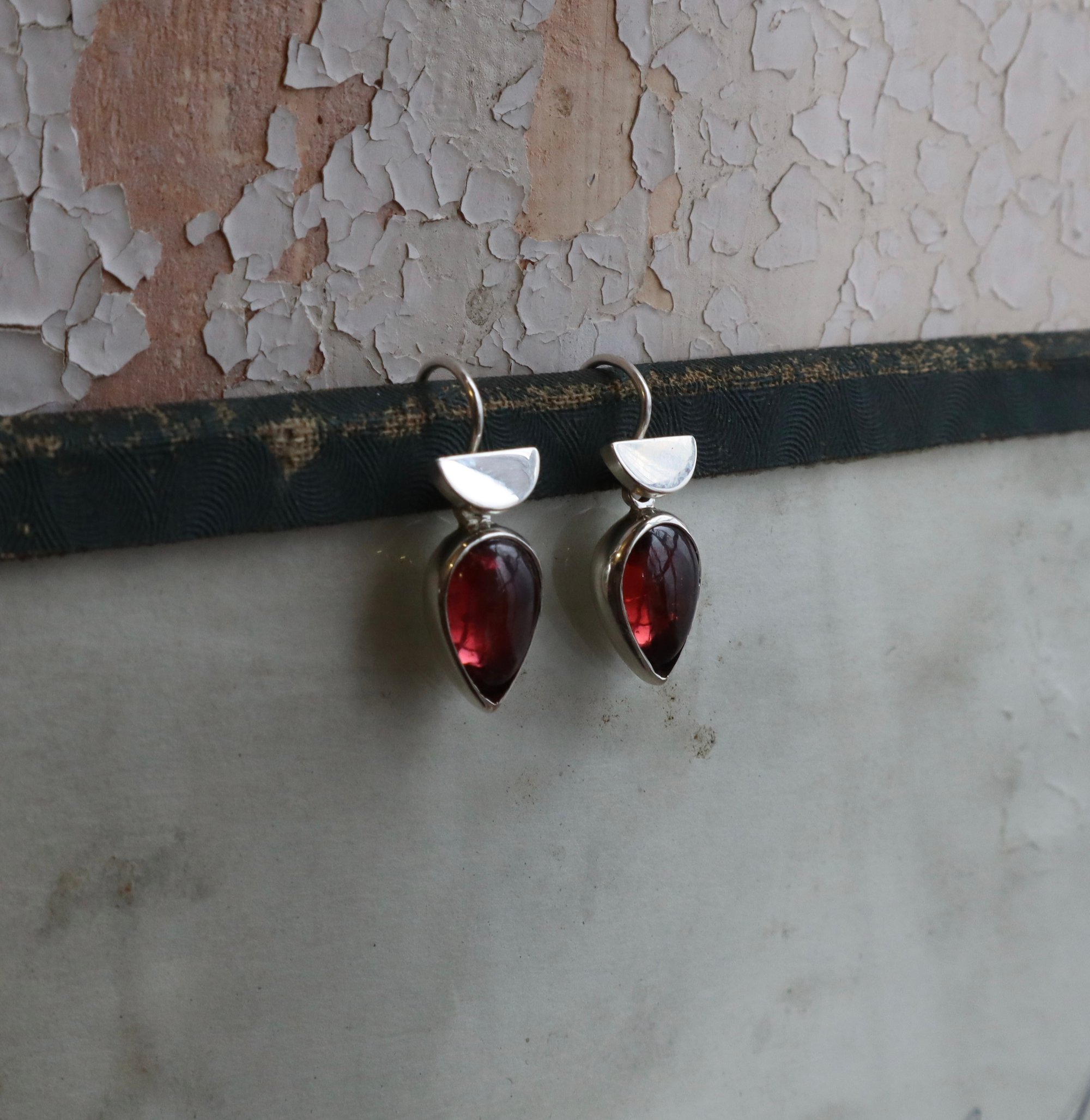 Pear shaped garnet set in silver with hinged deco ear wires in silver.